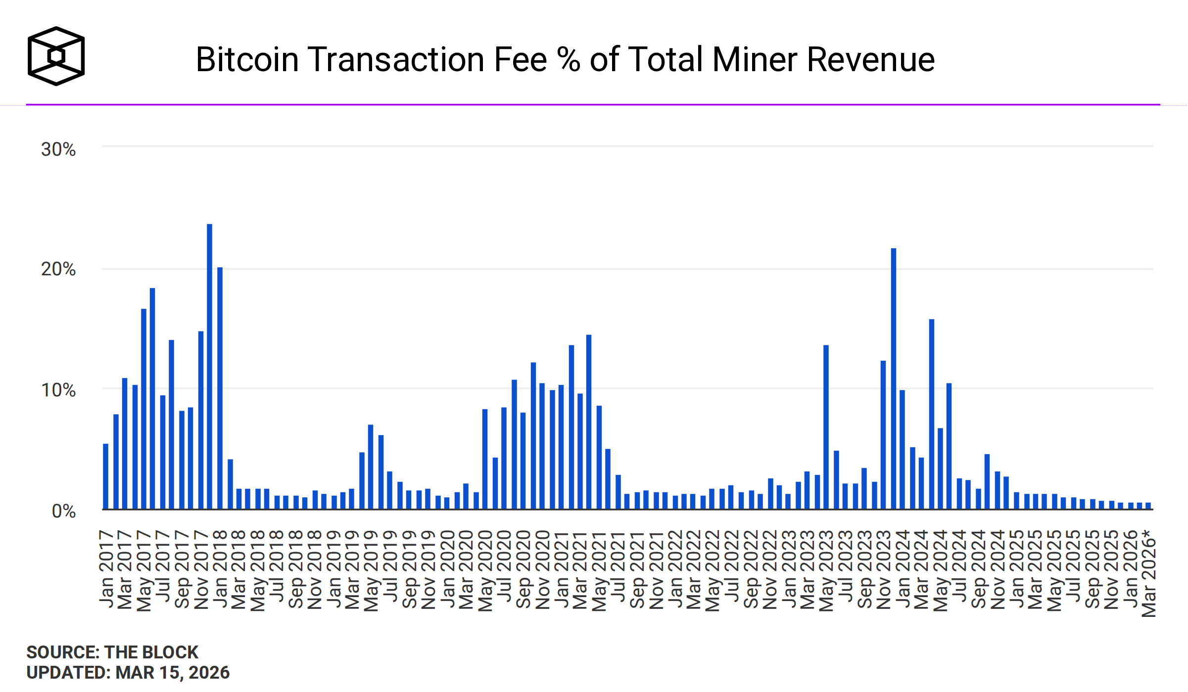 Currently, the hash rate is down about 7% from its peak, but it has grown nearly 4x since early 2023. However, a challenge is coming up for miners. The network currently generates roughly $30M in daily block reward payouts (Source: Bitinfocharts). With the block rewards decreasing each halving every four years, miners face a revenue squeeze if BTC price appreciation or transaction fees (currently only ~0.6% of revenue) don't compensate for the reduction.