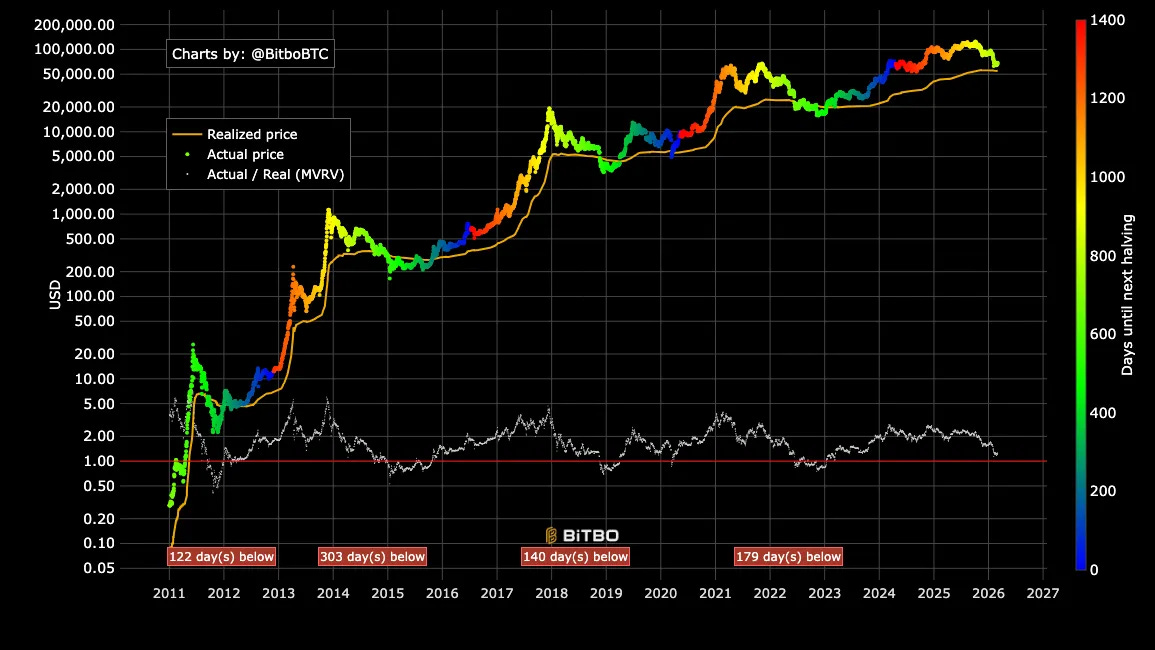 MVRV < 1: The majority are in unrealised loss. Values below 1 have historically marked bear market lows and great accumulation zones (see the red areas in the chart).