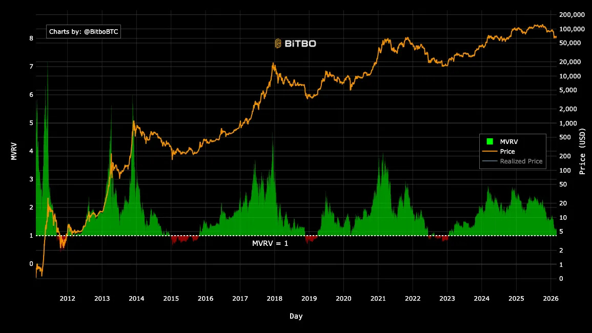 MVRV = 1: The price equals the average cost basis; most holders are at break-even.