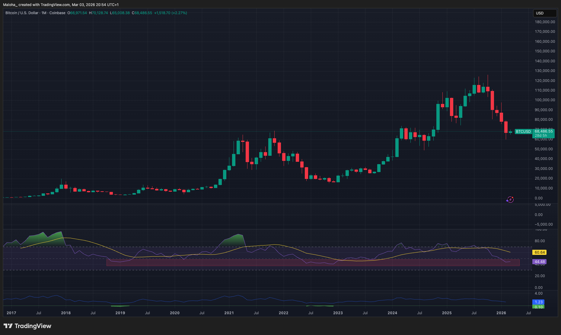 This helps me measure long-term momentum and potential trend exhaustion, filtering out short-term noise. As you see in the chart, the area between 44 and 39 are historically indicating a bottom area. Currently we sit at 44.44.