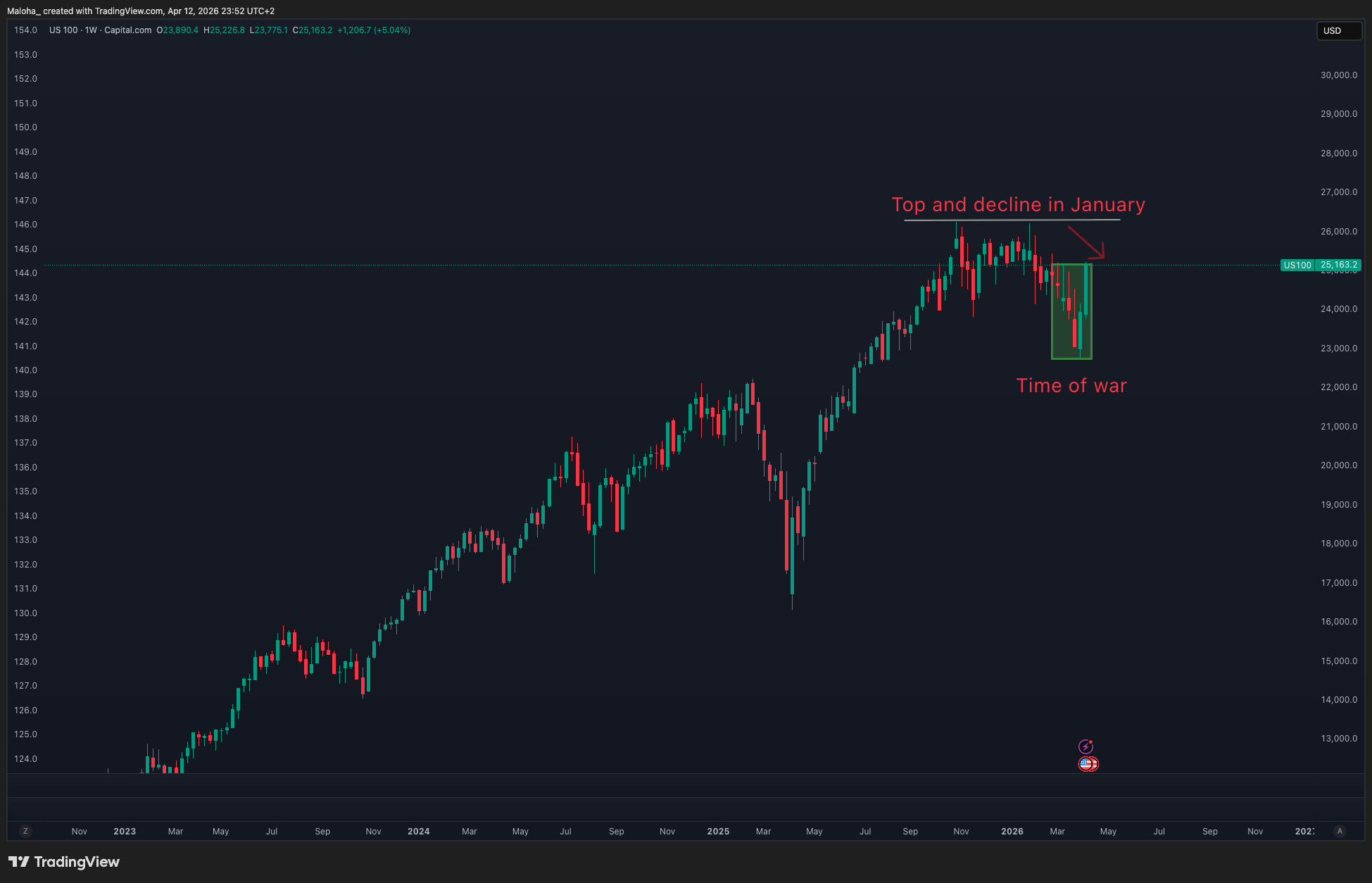 For me, the posts on X from Trump, are nothing more as noise in the global theatre and we will on a long not even realize in the chart pattern that anything happened. The market was already before the war in a bear market (for Bitcoin) and beyond the topping for the stocks.
