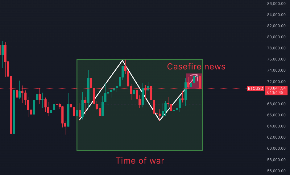 Bitcoin has moved up roughly 12% from its February 28th low. On the news of the ceasefire, it spiked initially but then retraced, leaving us with zero change.