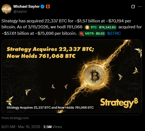 Michael Saylor has deployed roughly $3B into the market over the last two weeks, pushing his total holdings to 761,068 BTC. So that is a massive amount of money he raised and pumped into the system, which he was not able to do in the previous bear market. However, it is worth stating, that he did not have the big global standing back in 2022 as compared to now.